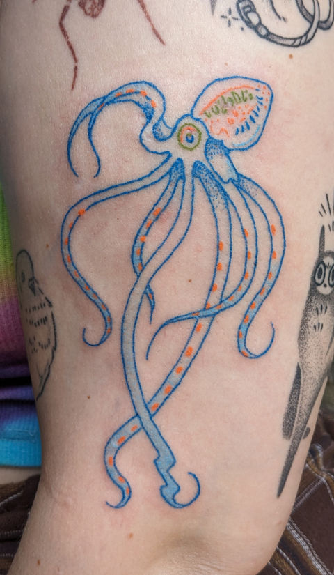 SpaceGhost is a tattoo artist and painter practicing from their co-owned, private studio located in Logan Square, Chicago, IL. They began manual and machine tattooing in 2022. Their practice is trauma-informed and consent driven, focusing on radical acceptance for all bodies and lived experiences. SpaceGhost is always accepting tattoo and custom painting or print requests, so reach out to create something beautiful together.